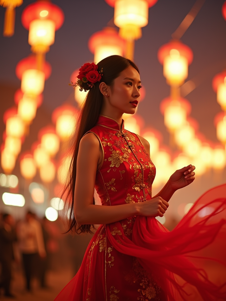a stunning model celebrating Chinese New Year, sky full of traditional floating lanterns, wearing a beautiful qipao dress in red and gold