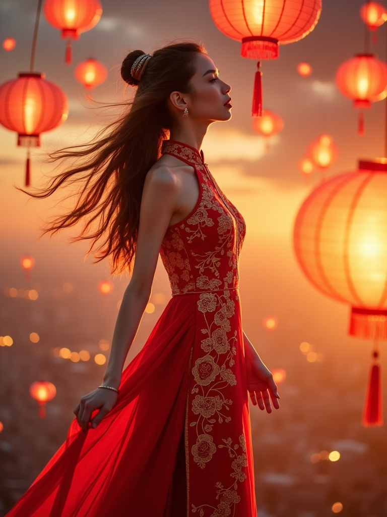 a stunning model celebrating Chinese New Year, sky full of traditional floating lanterns, wearing a beautiful qipao dress in red and gold