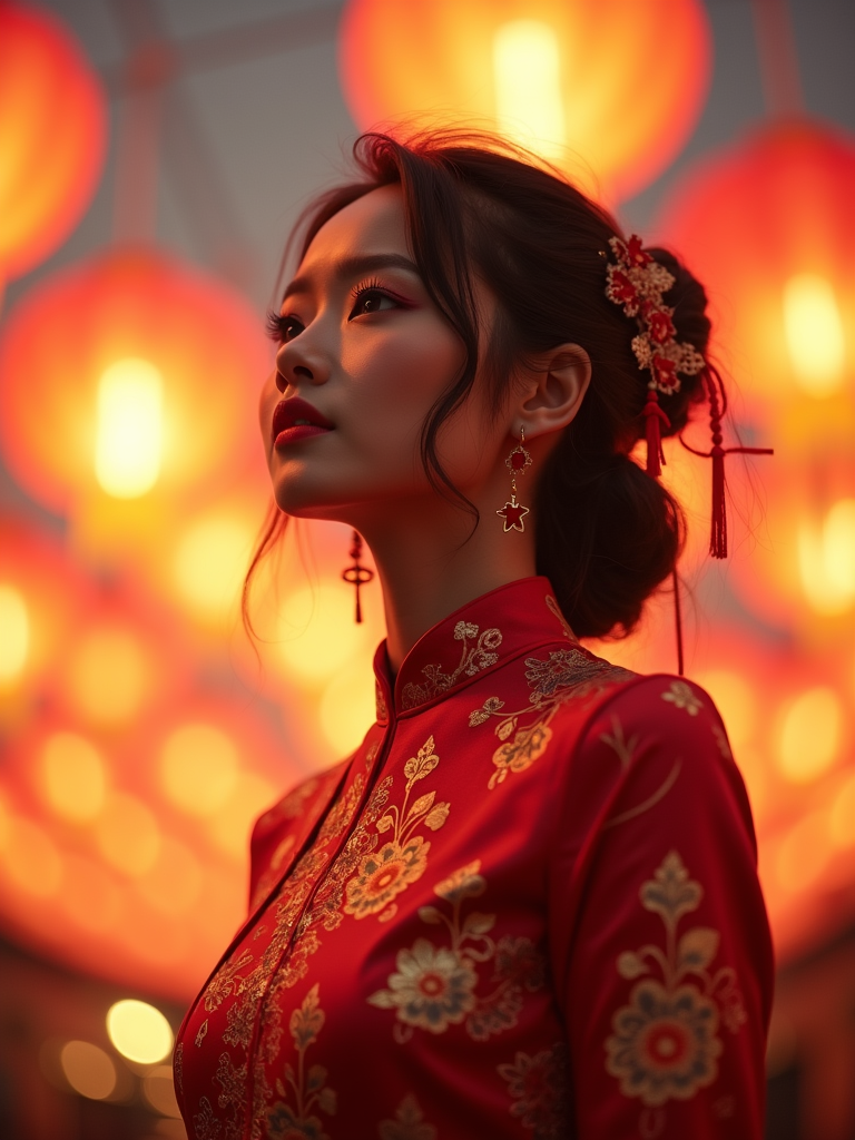 a stunning model celebrating Chinese New Year, sky full of traditional floating lanterns, wearing a beautiful qipao dress in red and gold