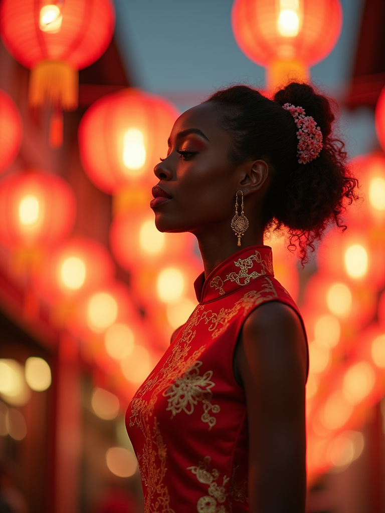 a stunning model celebrating Chinese New Year, sky full of traditional floating lanterns, wearing a beautiful qipao dress in red and gold