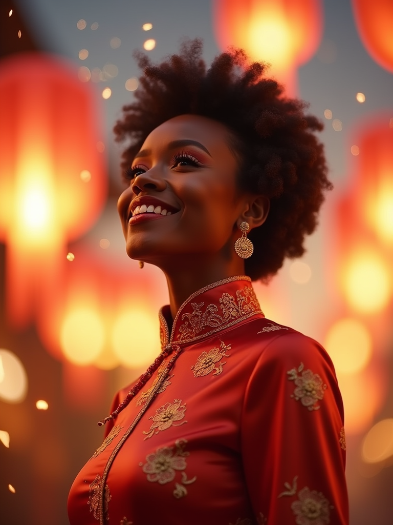 a stunning model celebrating Chinese New Year, sky full of traditional floating lanterns, wearing a beautiful qipao dress in red and gold