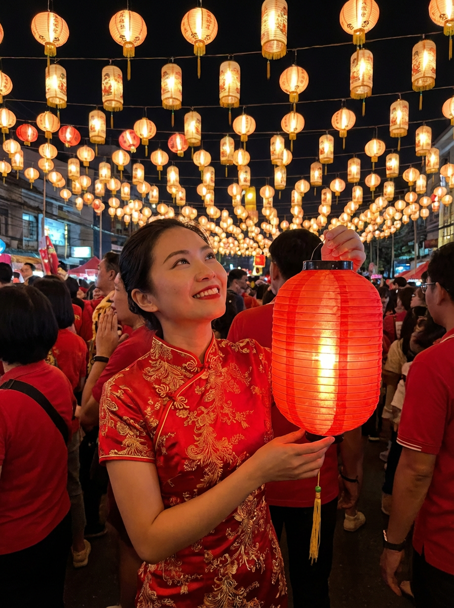 a stunning model celebrating Chinese New Year, sky full of traditional floating lanterns, wearing a beautiful qipao dress in red and gold