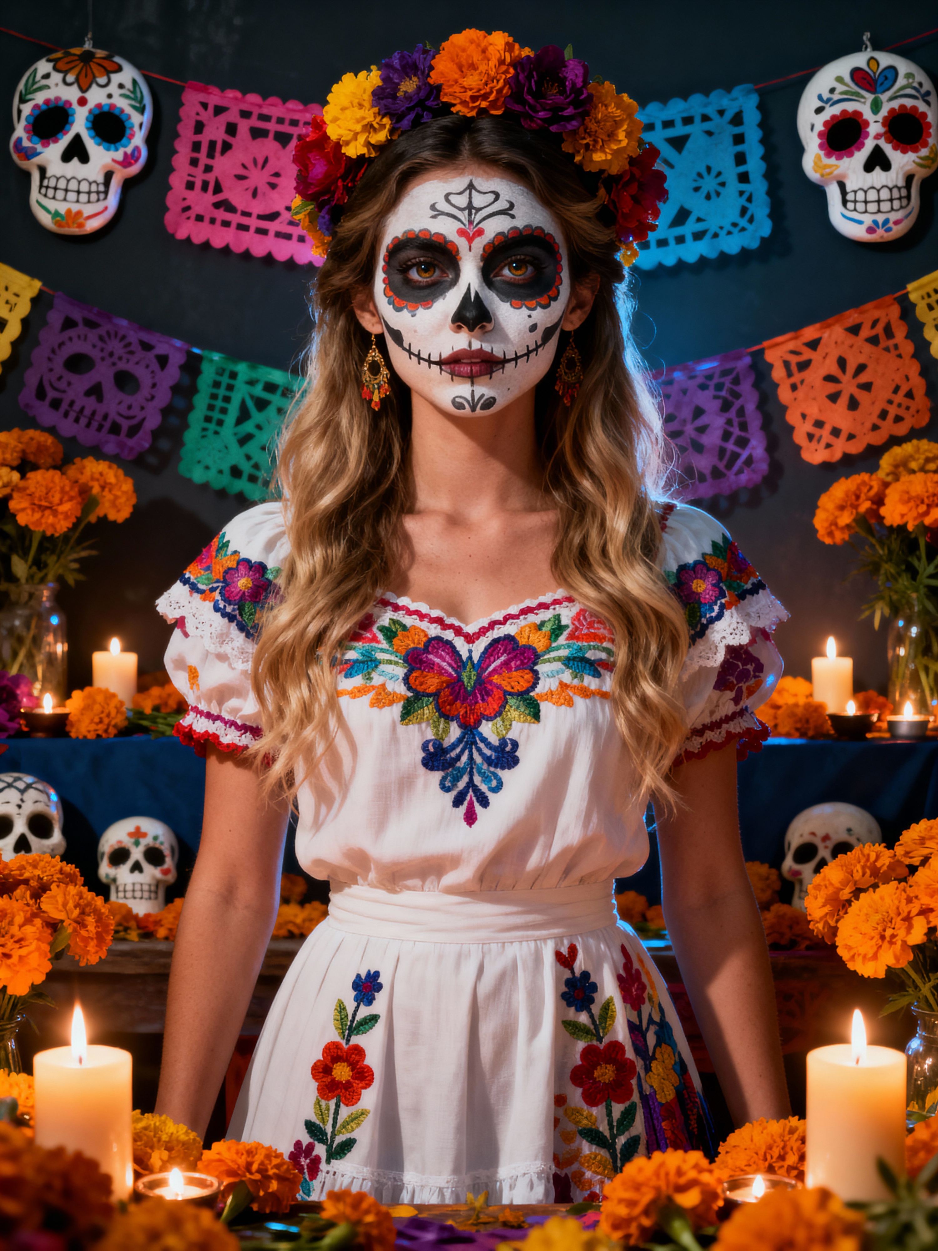 a stunning model celebrating Day of the Dead, surrounded by marigold flowers and candles, wearing a beautiful traditional dress with colorful embroidery , with sugar skull decorations and papel picado in the background