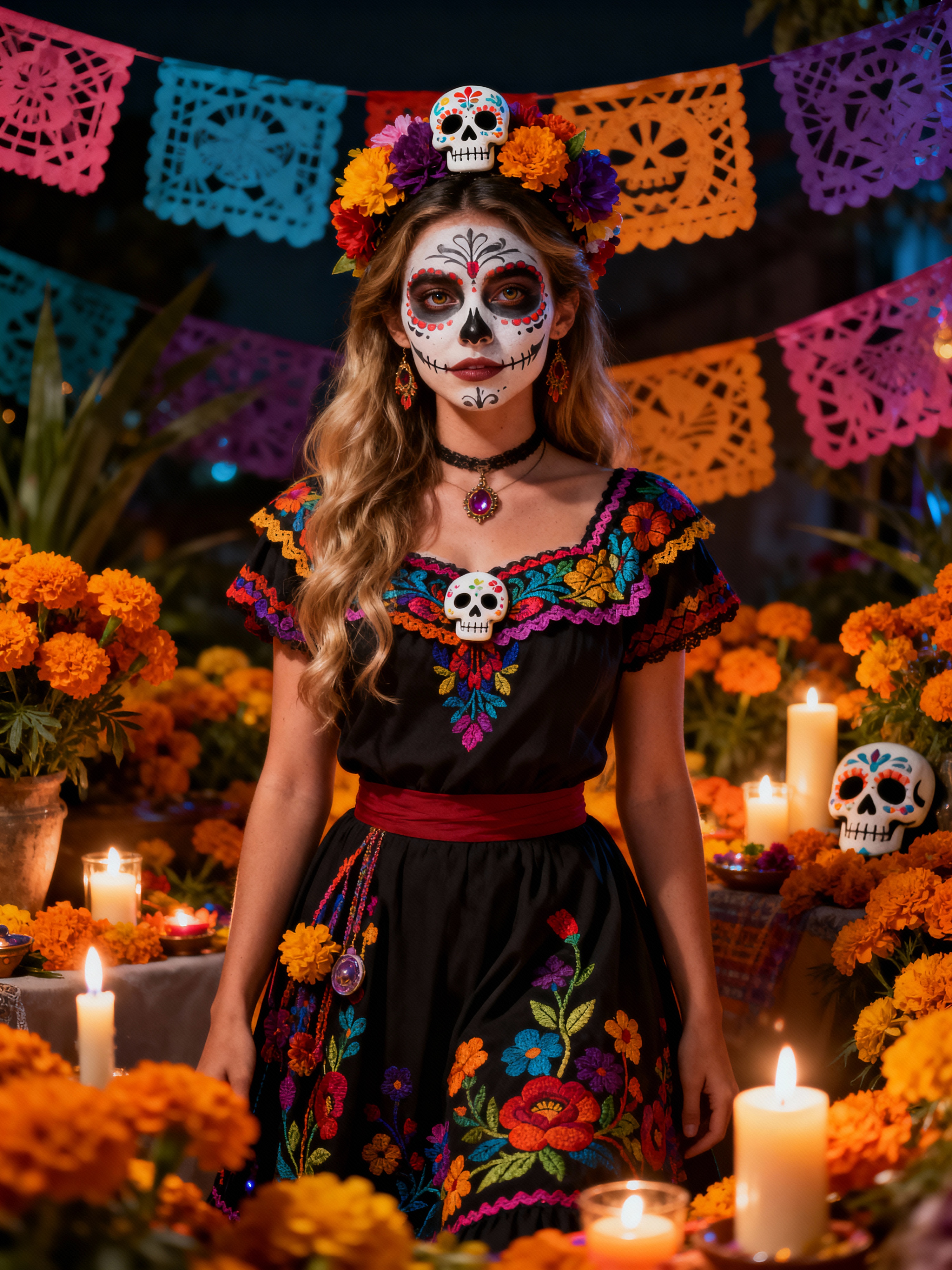 a stunning model celebrating Day of the Dead, surrounded by marigold flowers and candles, wearing a beautiful traditional dress with colorful embroidery , with sugar skull decorations and papel picado in the background