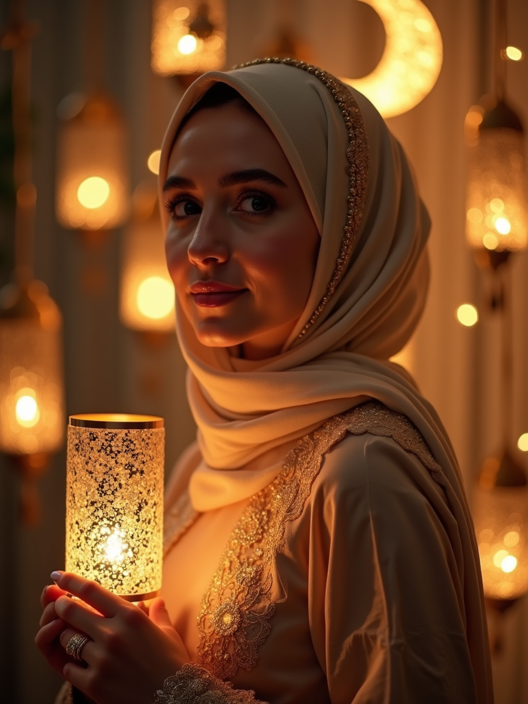 a stunning model celebrating Eid, surrounded by traditional lanterns and fairy lights, wearing a beautiful modest outfit with elegant hijab , with crescent moon decorations in the background