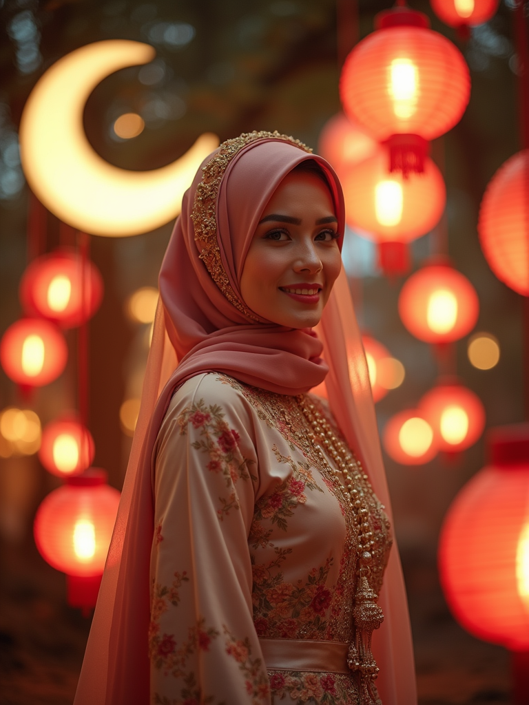 a stunning model celebrating Eid, surrounded by traditional lanterns and fairy lights, wearing a beautiful modest outfit with elegant hijab , with crescent moon decorations in the background