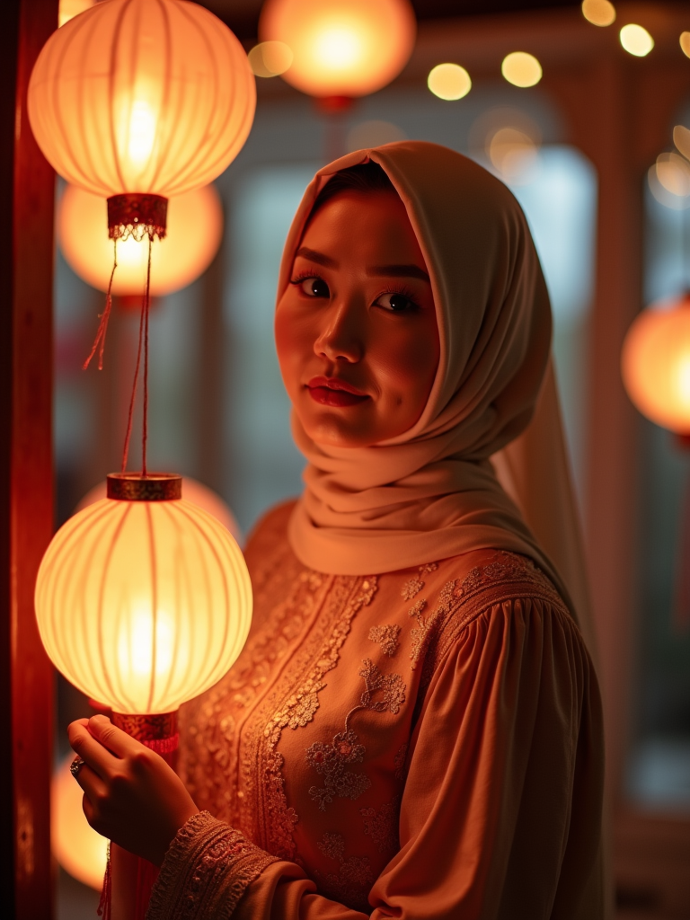 a stunning model celebrating Eid, surrounded by traditional lanterns and fairy lights, wearing a beautiful modest outfit with elegant hijab , with crescent moon decorations in the background
