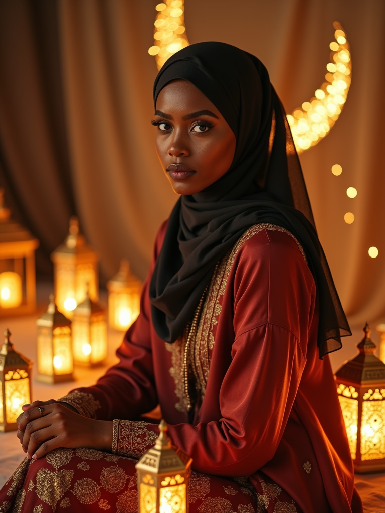 a stunning model celebrating Eid, surrounded by traditional lanterns and fairy lights, wearing a beautiful modest outfit with elegant hijab , with crescent moon decorations in the background