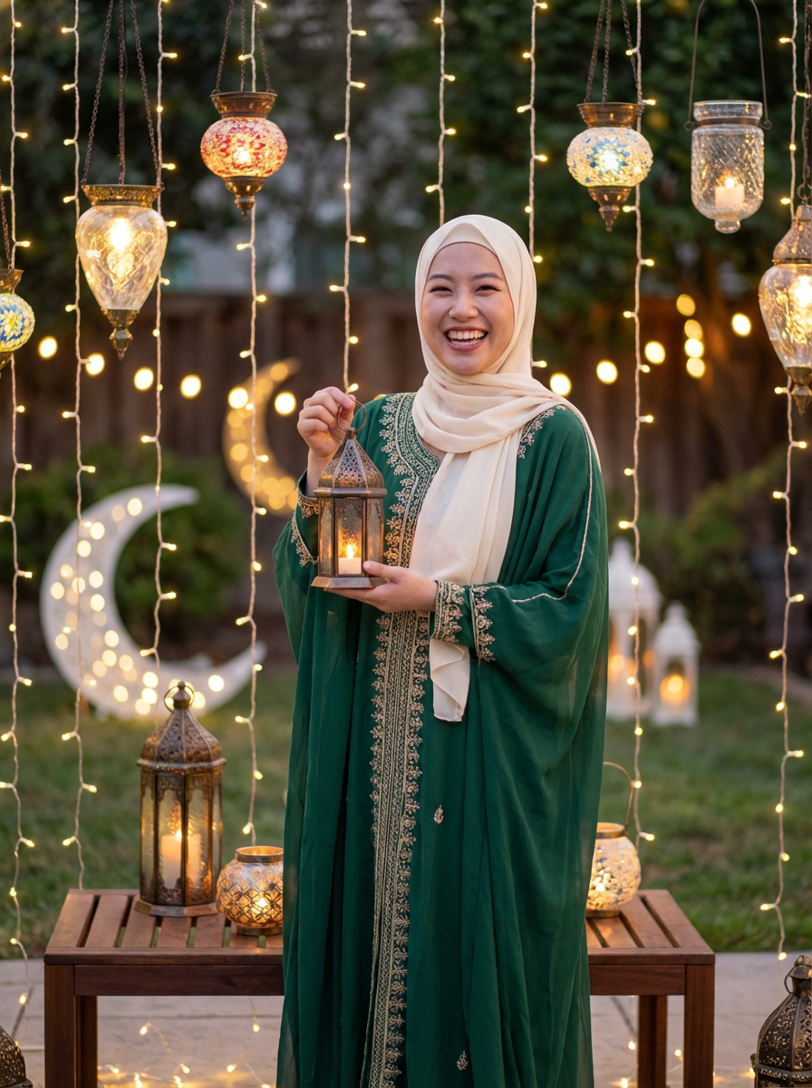 a stunning model celebrating Eid, surrounded by traditional lanterns and fairy lights, wearing a beautiful modest outfit with elegant hijab , with crescent moon decorations in the background