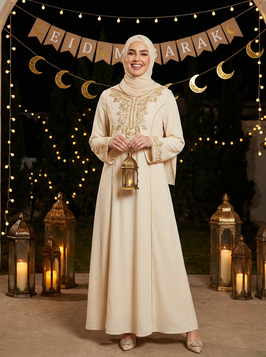 a stunning model celebrating Eid, surrounded by traditional lanterns and fairy lights, wearing a beautiful modest outfit with elegant hijab , with crescent moon decorations in the background