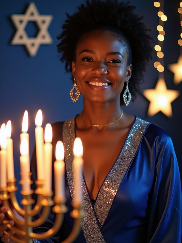 a stunning model celebrating Hanukkah, surrounded by lit menorahs and twinkling lights, wearing a beautiful modest outfit in blue and silver , with Star of David decorations in the background