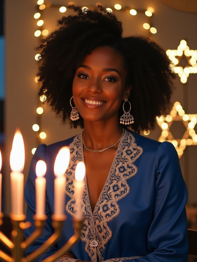 a stunning model celebrating Hanukkah, surrounded by lit menorahs and twinkling lights, wearing a beautiful modest outfit in blue and silver , with Star of David decorations in the background