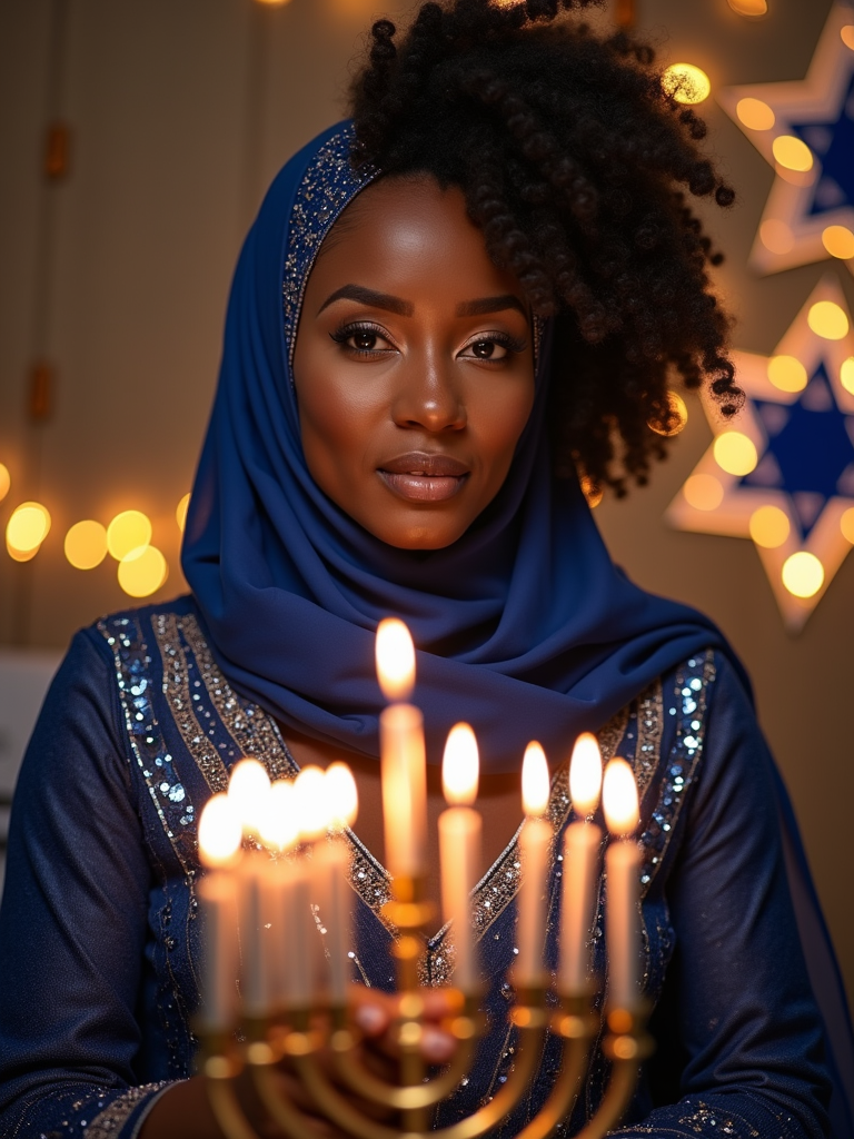 a stunning model celebrating Hanukkah, surrounded by lit menorahs and twinkling lights, wearing a beautiful modest outfit in blue and silver , with Star of David decorations in the background