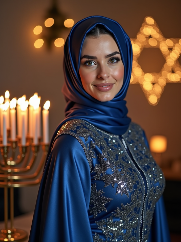 a stunning model celebrating Hanukkah, surrounded by lit menorahs and twinkling lights, wearing a beautiful modest outfit in blue and silver , with Star of David decorations in the background