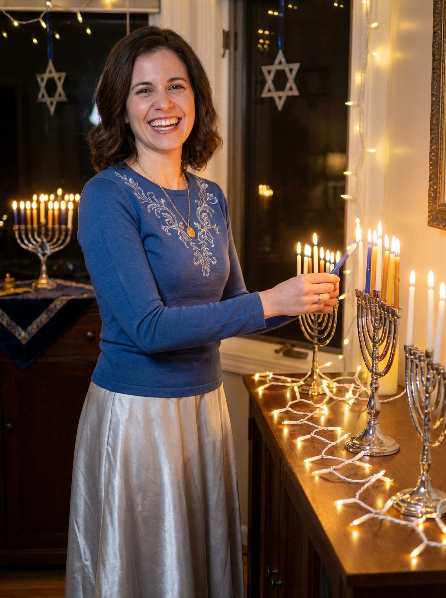 a stunning model celebrating Hanukkah, surrounded by lit menorahs and twinkling lights, wearing a beautiful modest outfit in blue and silver , with Star of David decorations in the background