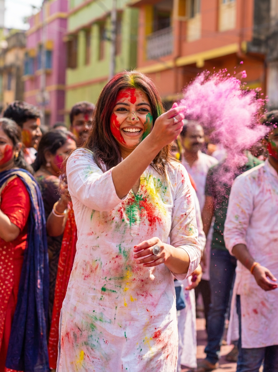 a stunning model celebrating Holi festival, covered in vibrant colored powders, wearing a white traditional kurta , joyfully throwing colorful powder in the air against a festive background