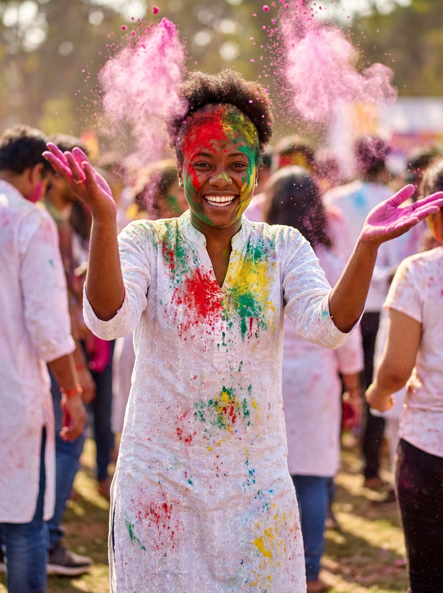 a stunning model celebrating Holi festival, covered in vibrant colored powders, wearing a white traditional kurta , joyfully throwing colorful powder in the air against a festive background