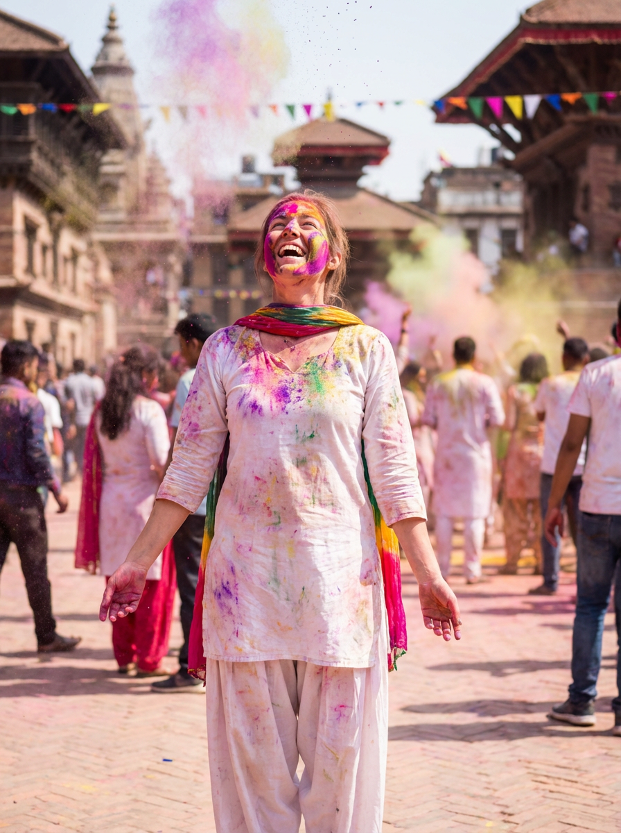 a stunning model celebrating Holi festival, covered in vibrant colored powders, wearing a white traditional kurta , joyfully throwing colorful powder in the air against a festive background