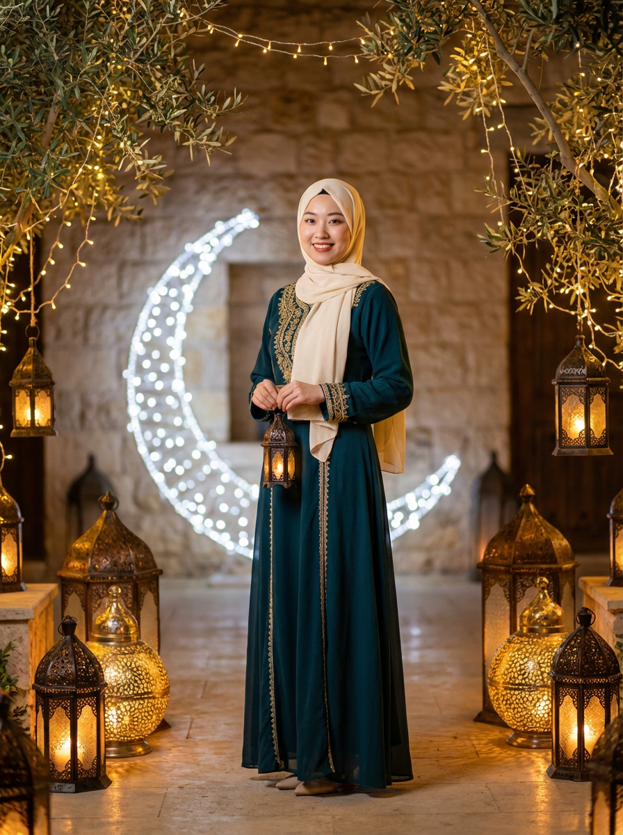 a stunning model celebrating Ramadan, surrounded by traditional lanterns and fairy lights, wearing a beautiful modest outfit with elegant hijab , with crescent moon decorations in the background