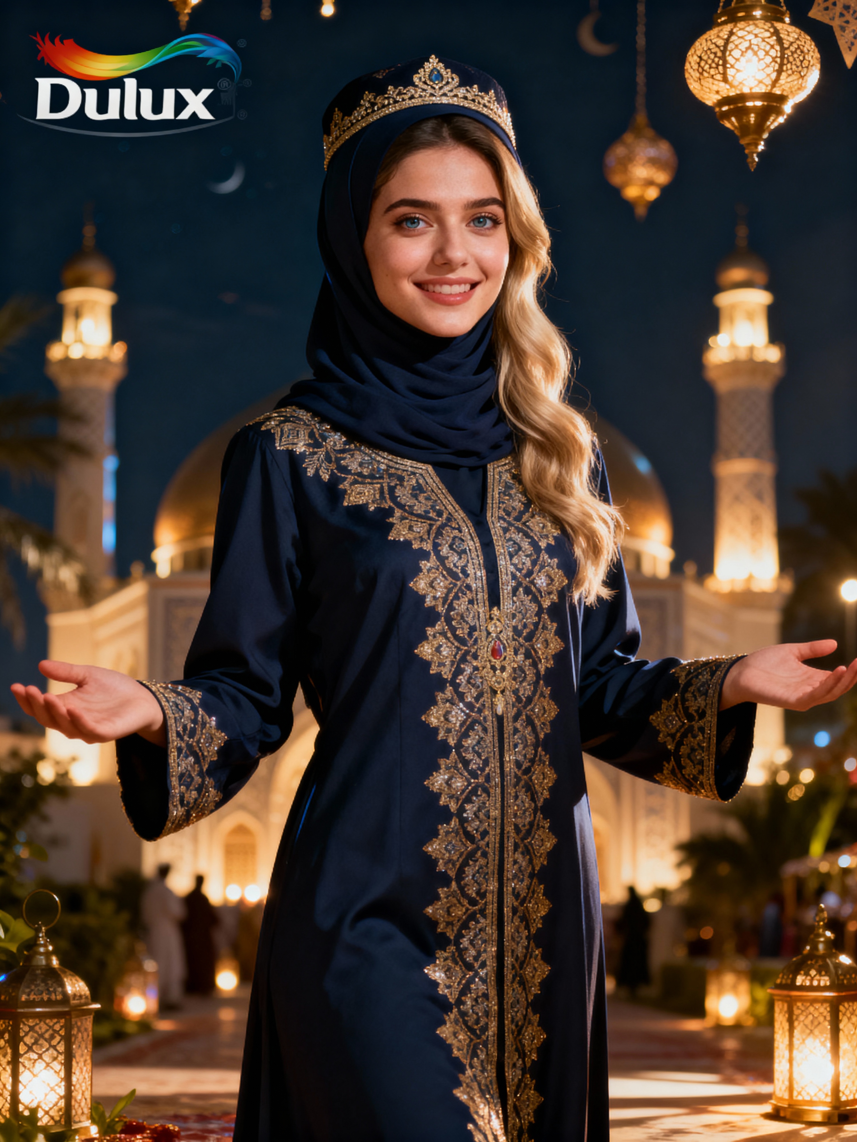 a stunning model in a festive modest outfit for Eid celebrations , embodying the joy and gratitude of the holiday