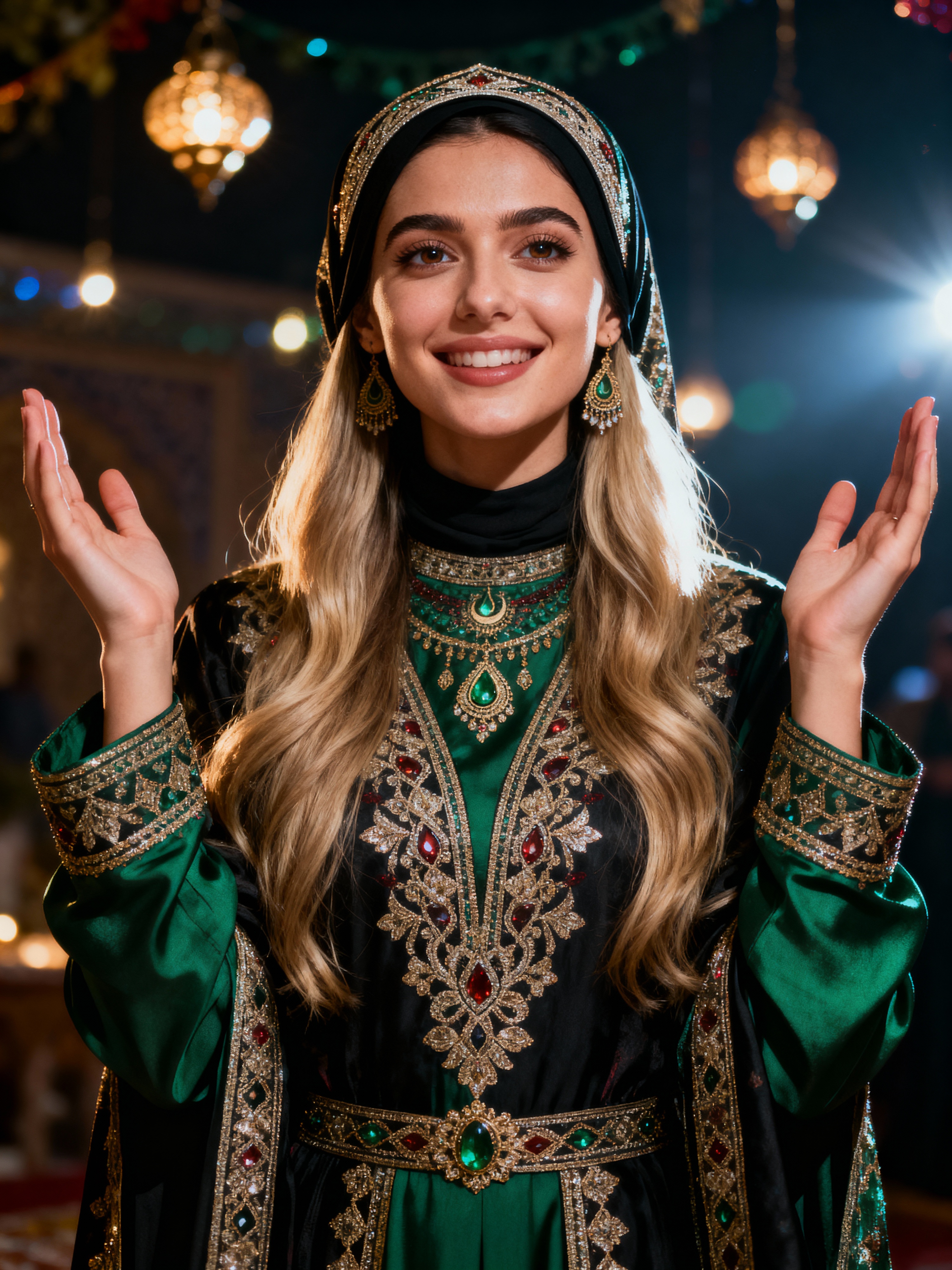 a stunning model in a festive modest outfit for Eid celebrations , embodying the joy and gratitude of the holiday