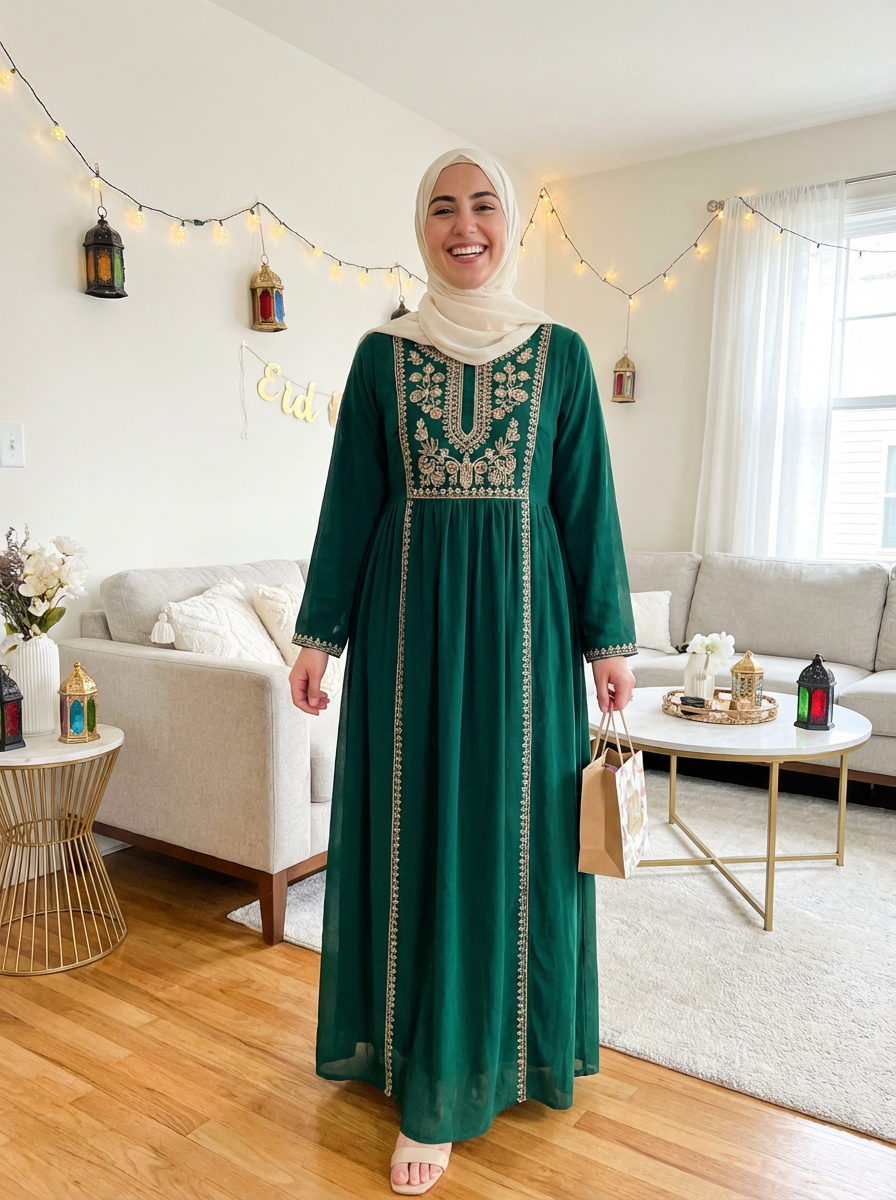 a stunning model in a festive modest outfit for Eid celebrations , embodying the joy and gratitude at the culmination of Ramadan
