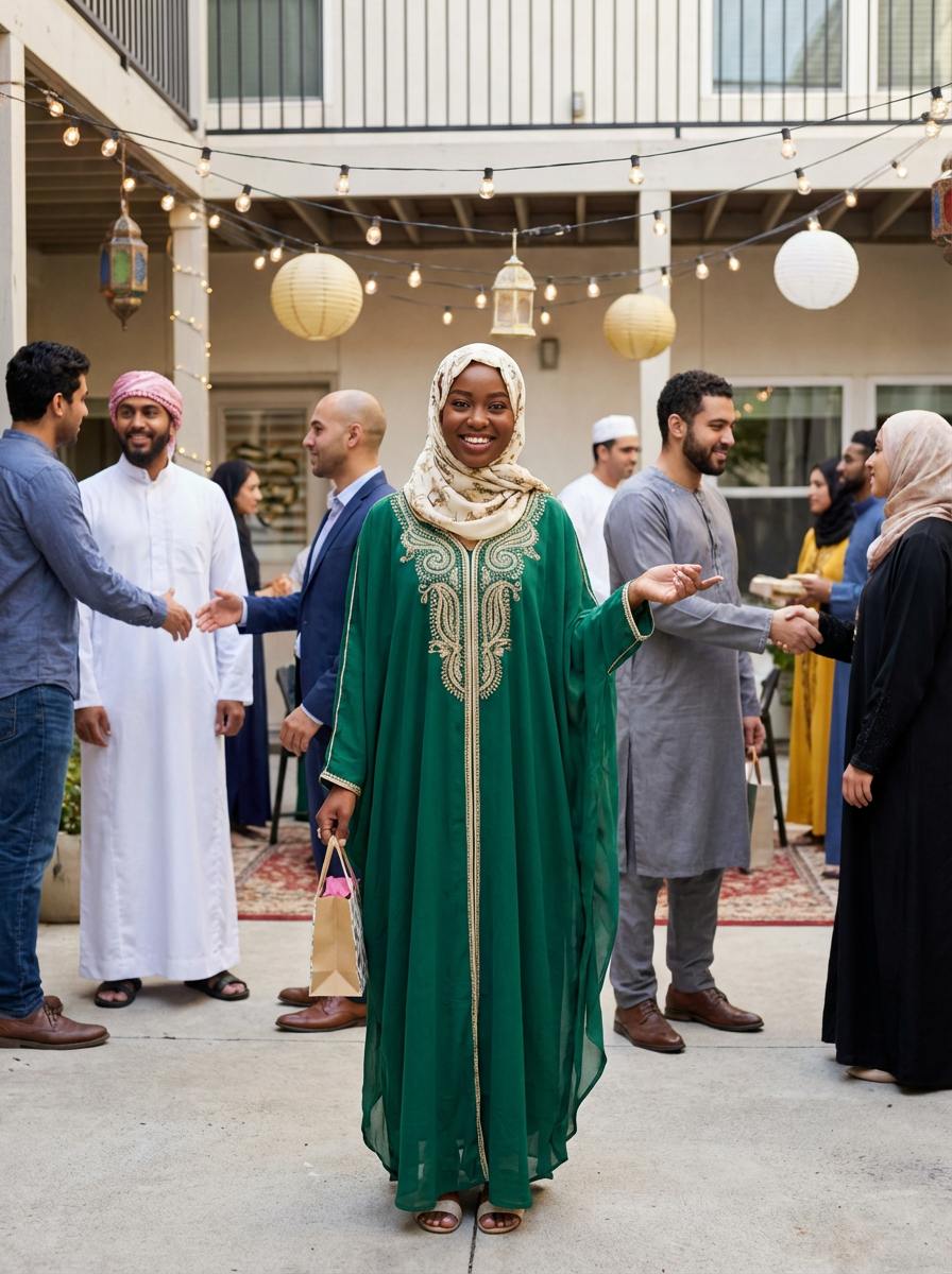 a stunning model in a festive modest outfit for Eid celebrations , embodying the joy and gratitude at the culmination of Ramadan