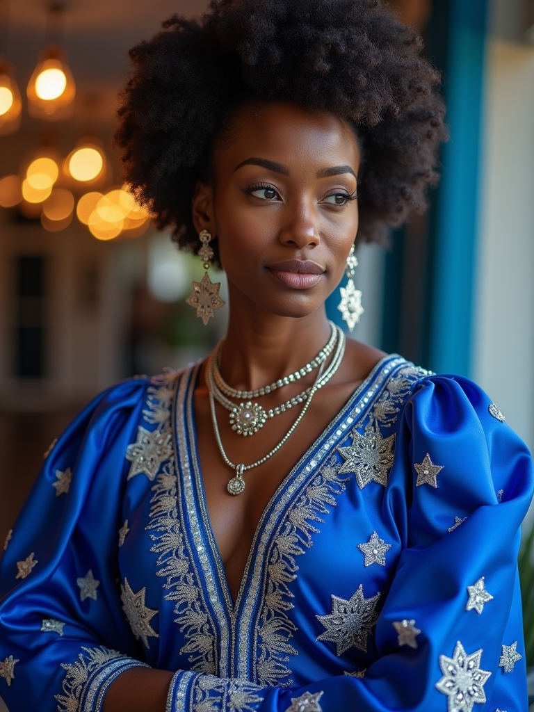 a stunning model in a festive outfit in blue, white and silver , embodying the resilience and faith celebrated during Hanukkah