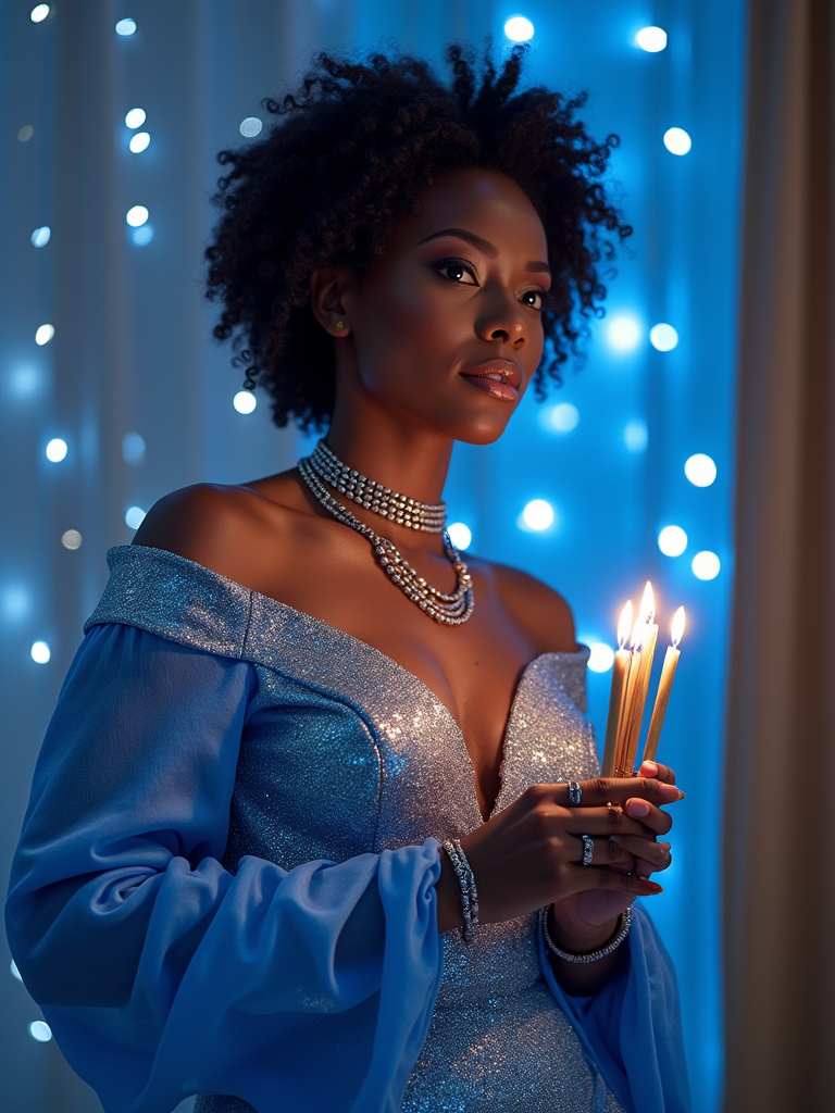 a stunning model in a festive outfit in blue, white and silver , embodying the resilience and faith celebrated during Hanukkah