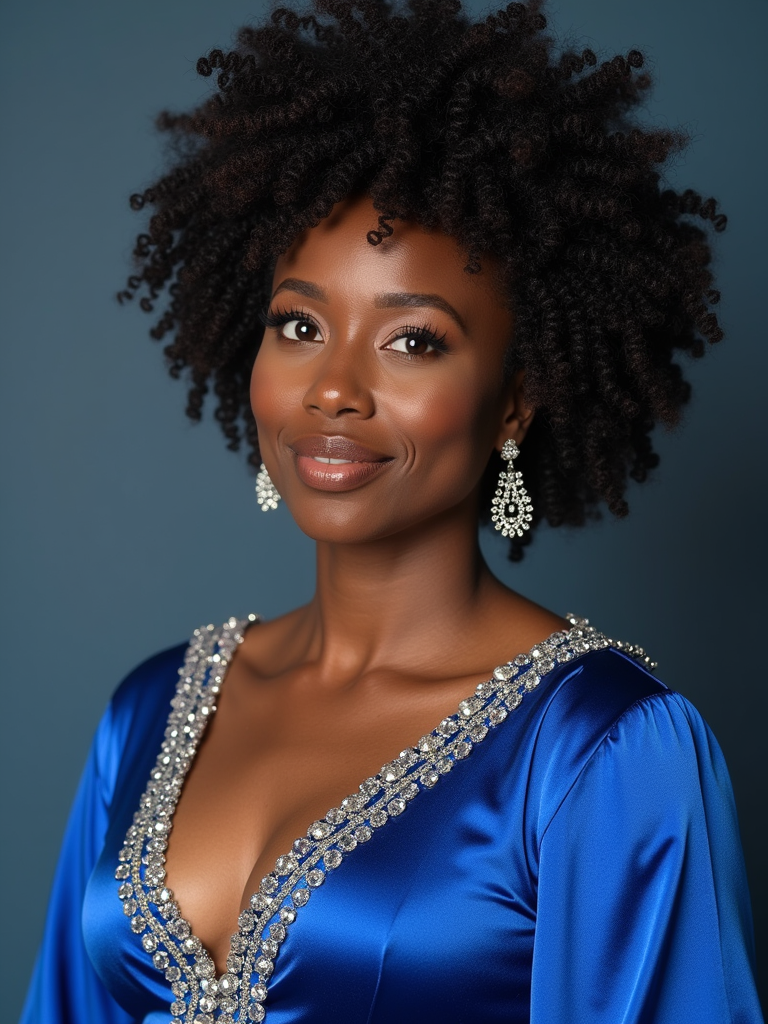 a stunning model in a festive outfit in blue, white and silver , embodying the resilience and faith celebrated during Hanukkah