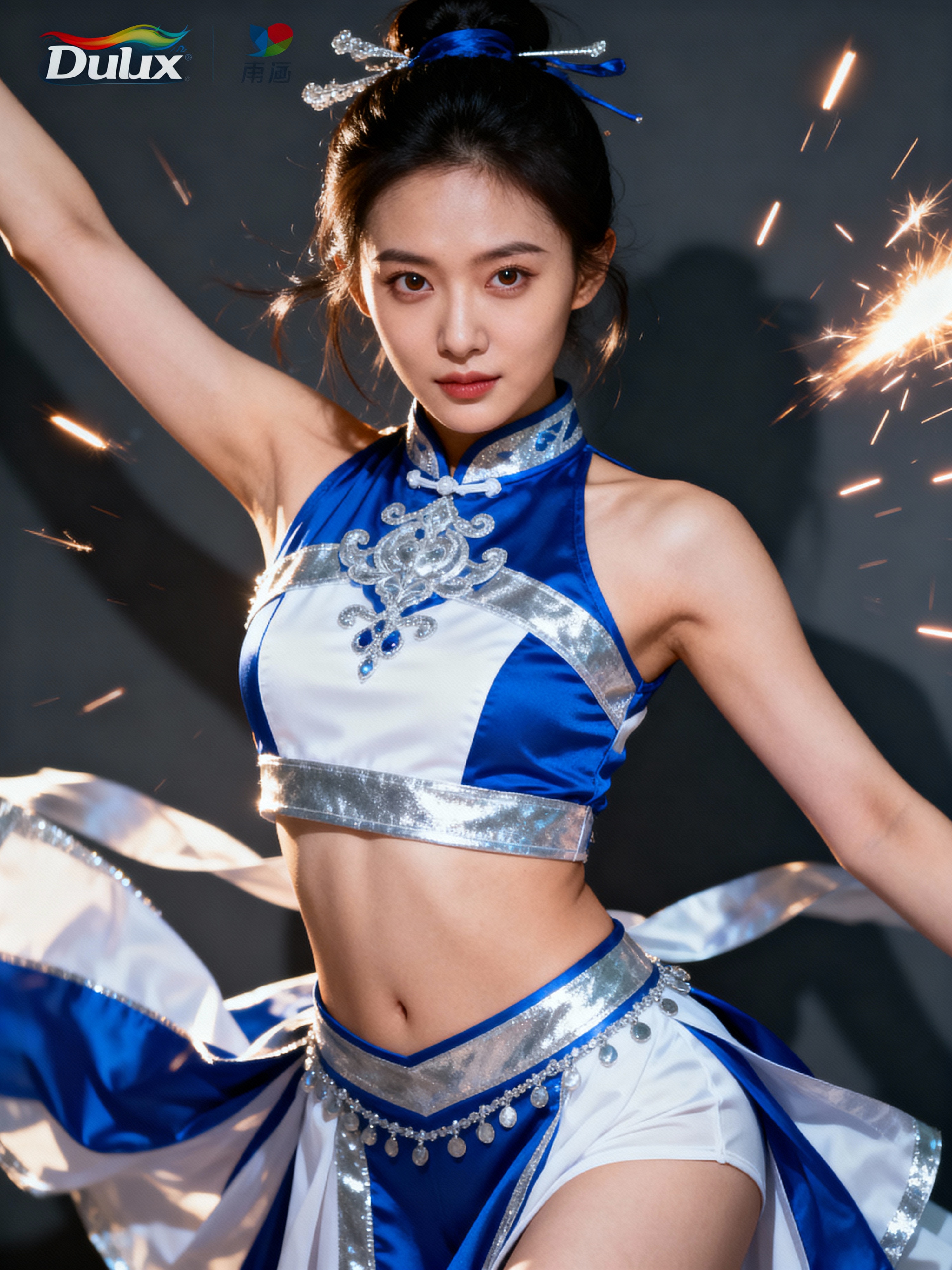 a stunning model in a festive outfit in blue, white and silver , embodying the resilience and faith celebrated during Hanukkah