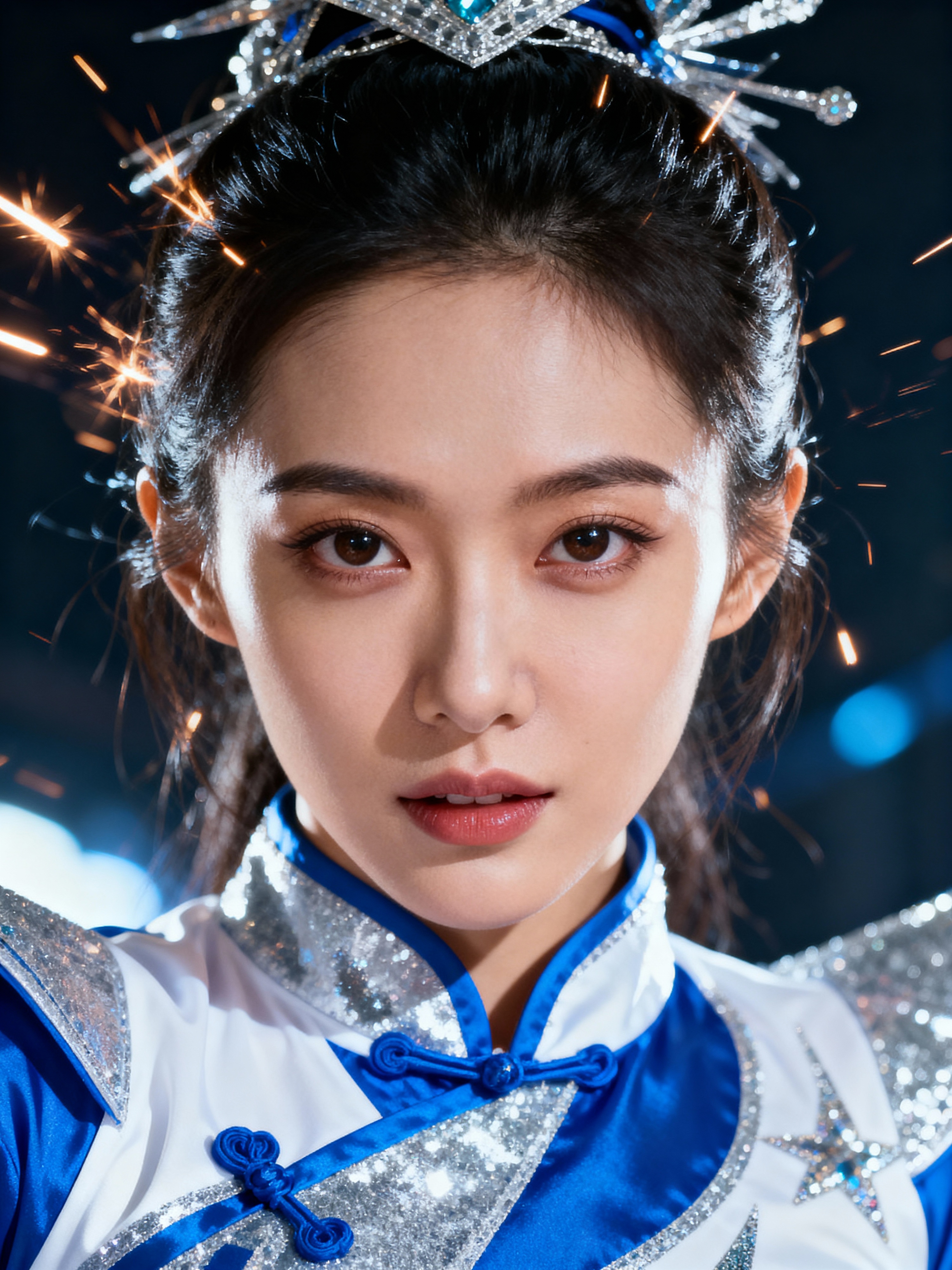 a stunning model in a festive outfit in blue, white and silver , embodying the resilience and faith celebrated during Hanukkah
