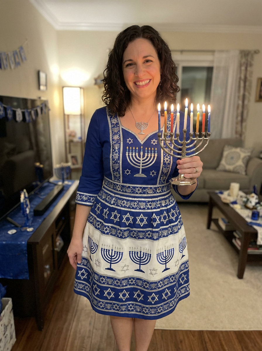 a stunning model in a festive outfit in blue, white and silver , embodying the resilience and faith celebrated during Hanukkah
