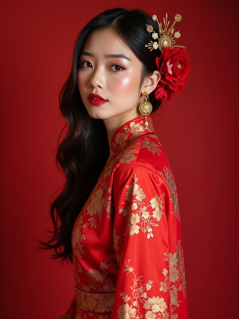 a stunning model in a festive outfit in lucky red and gold , embodying the hope and new beginnings of the Lunar New Year