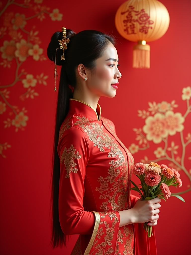 a stunning model in a festive outfit in lucky red and gold , embodying the hope and new beginnings of the Lunar New Year