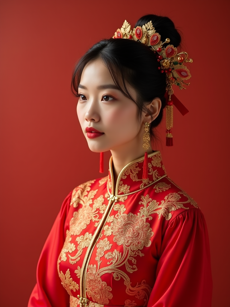 a stunning model in a festive outfit in lucky red and gold , embodying the hope and new beginnings of the Lunar Chinese New Year