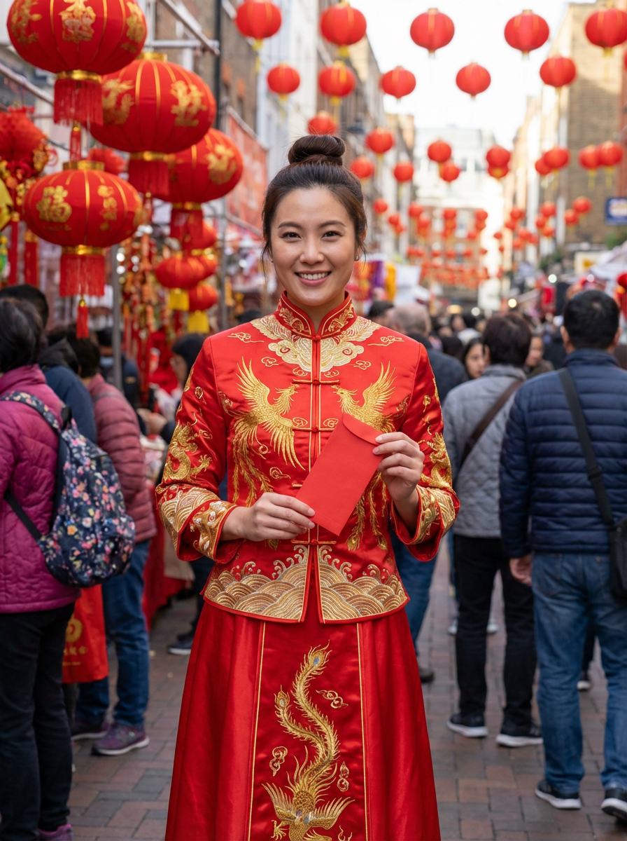 a stunning model in a festive outfit in lucky red and gold , embodying the hope and new beginnings of the Lunar Chinese New Year
