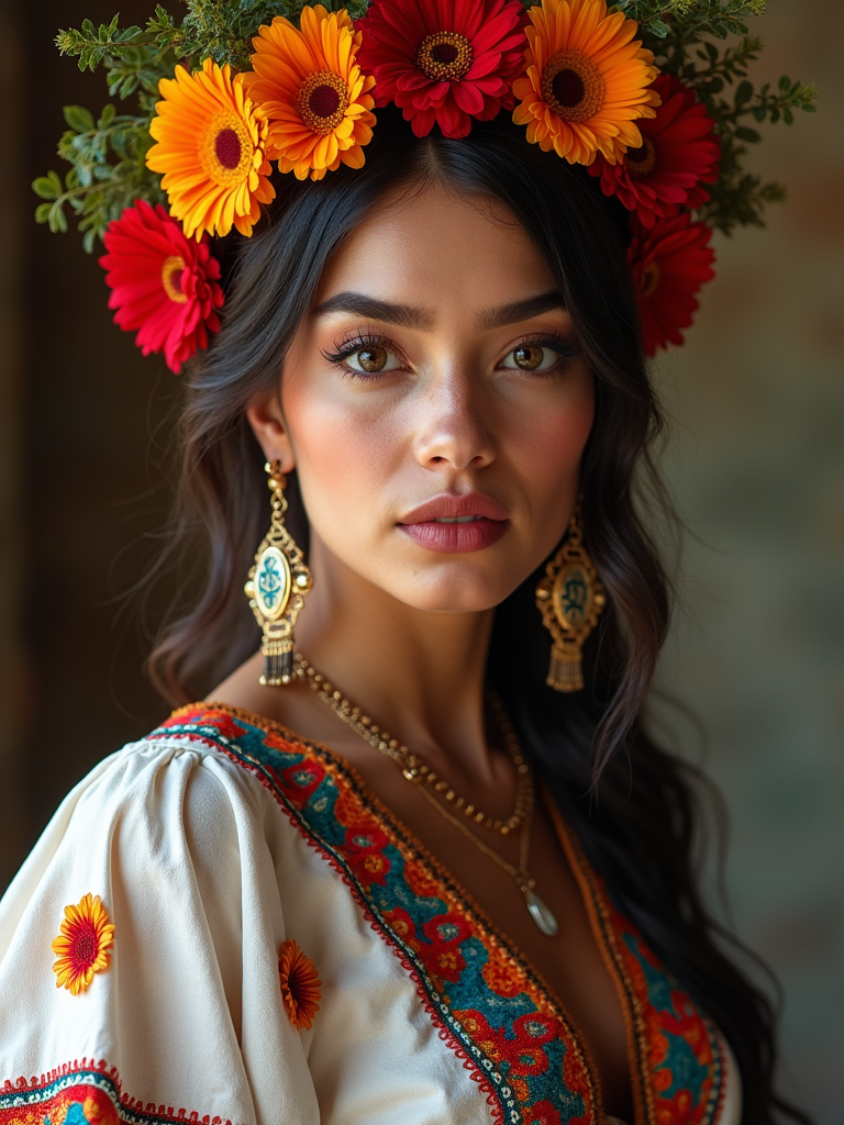 a stunning model in a festive outfit with traditional Mexican embroidery , embodying the remembrance and celebration of ancestors
