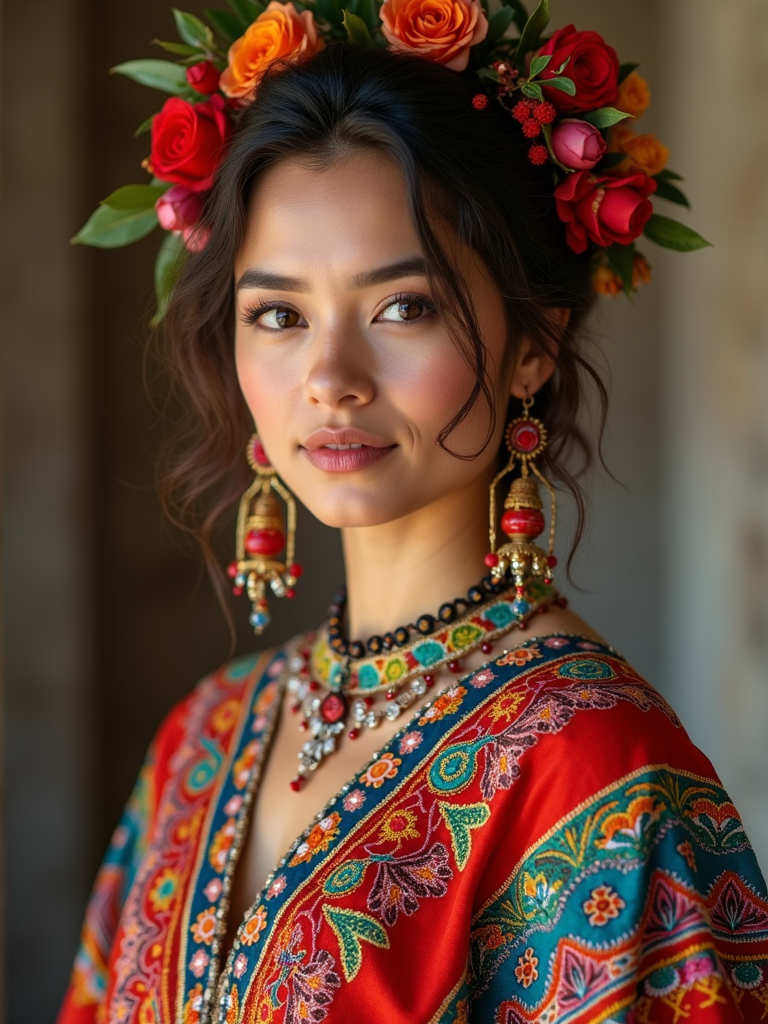 a stunning model in a festive outfit with traditional Mexican embroidery , embodying the remembrance and celebration of ancestors