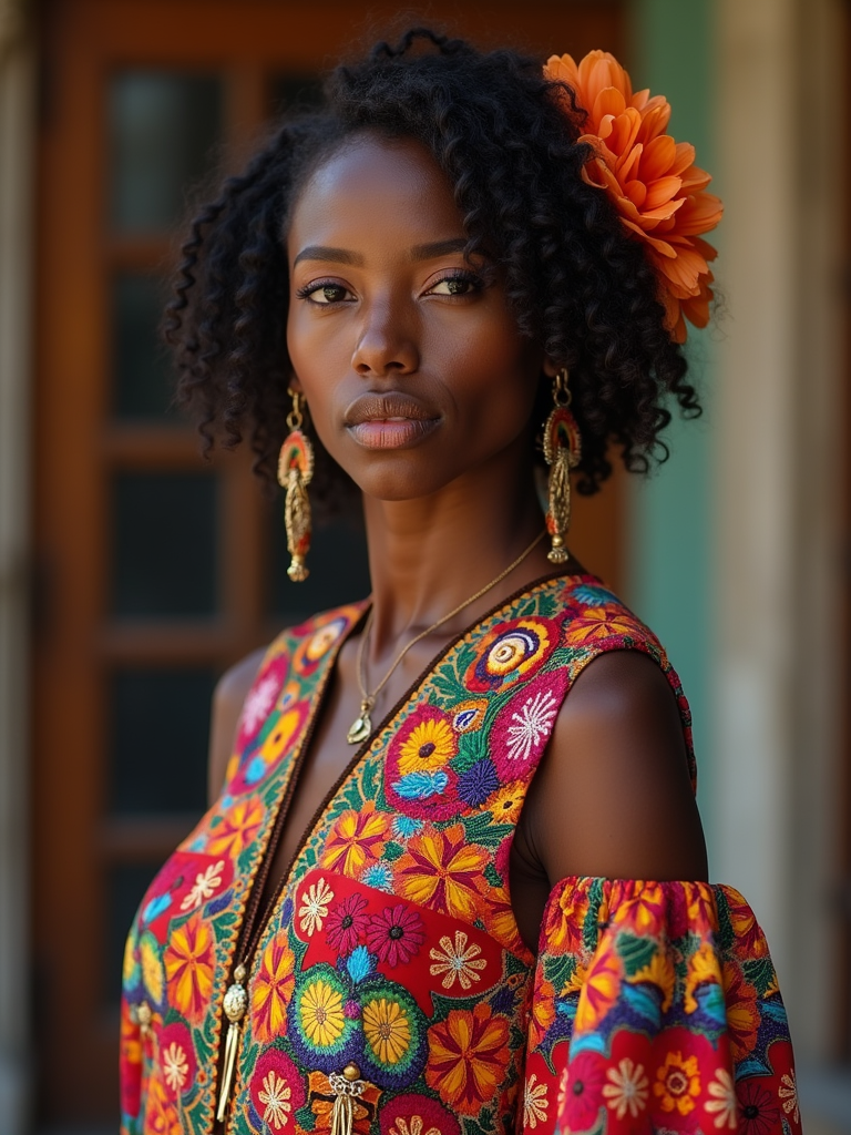 a stunning model in a festive outfit with traditional Mexican embroidery , embodying the remembrance and celebration of ancestors