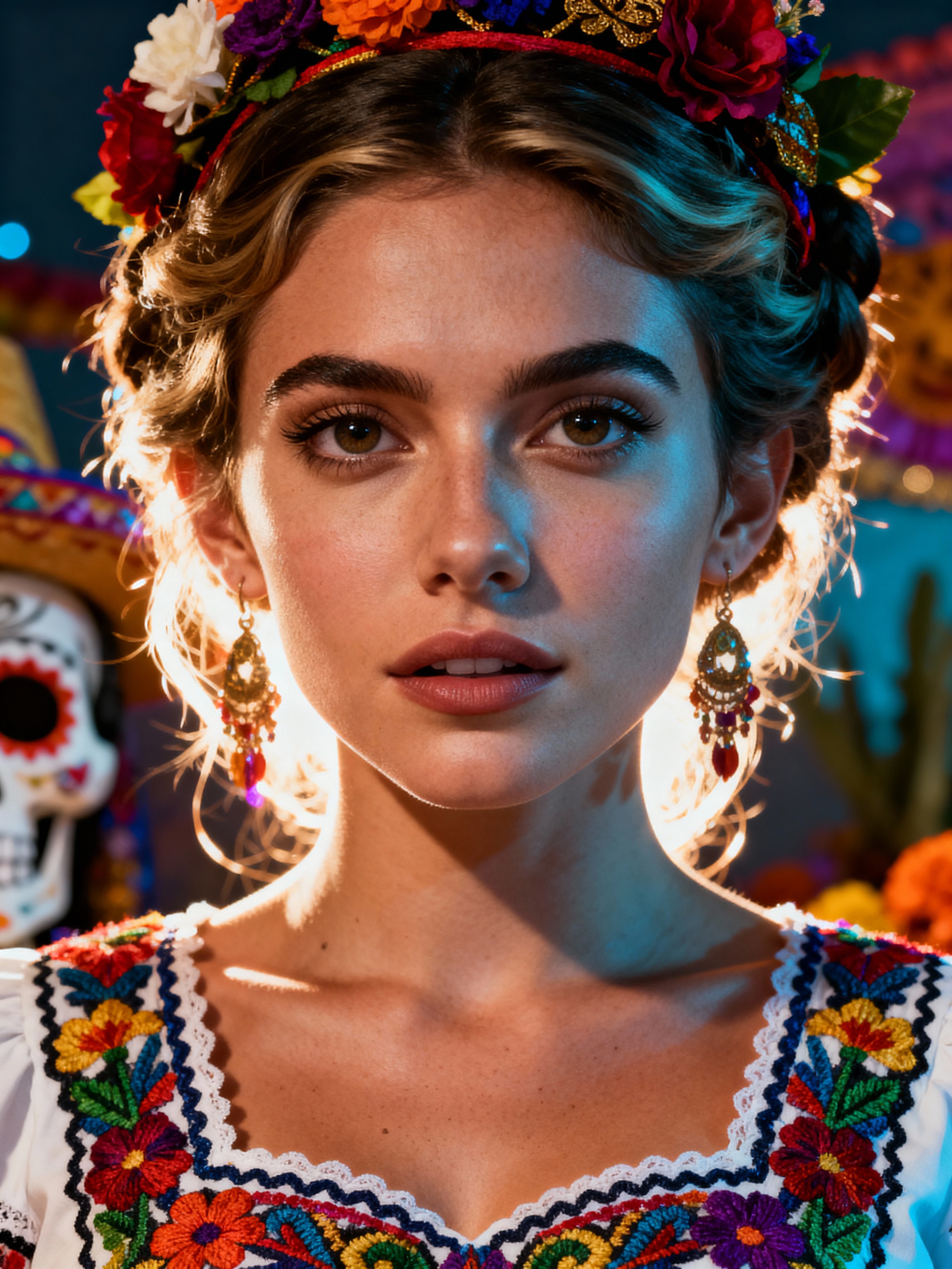 a stunning model in a festive outfit with traditional Mexican embroidery , embodying the remembrance and celebration of ancestors