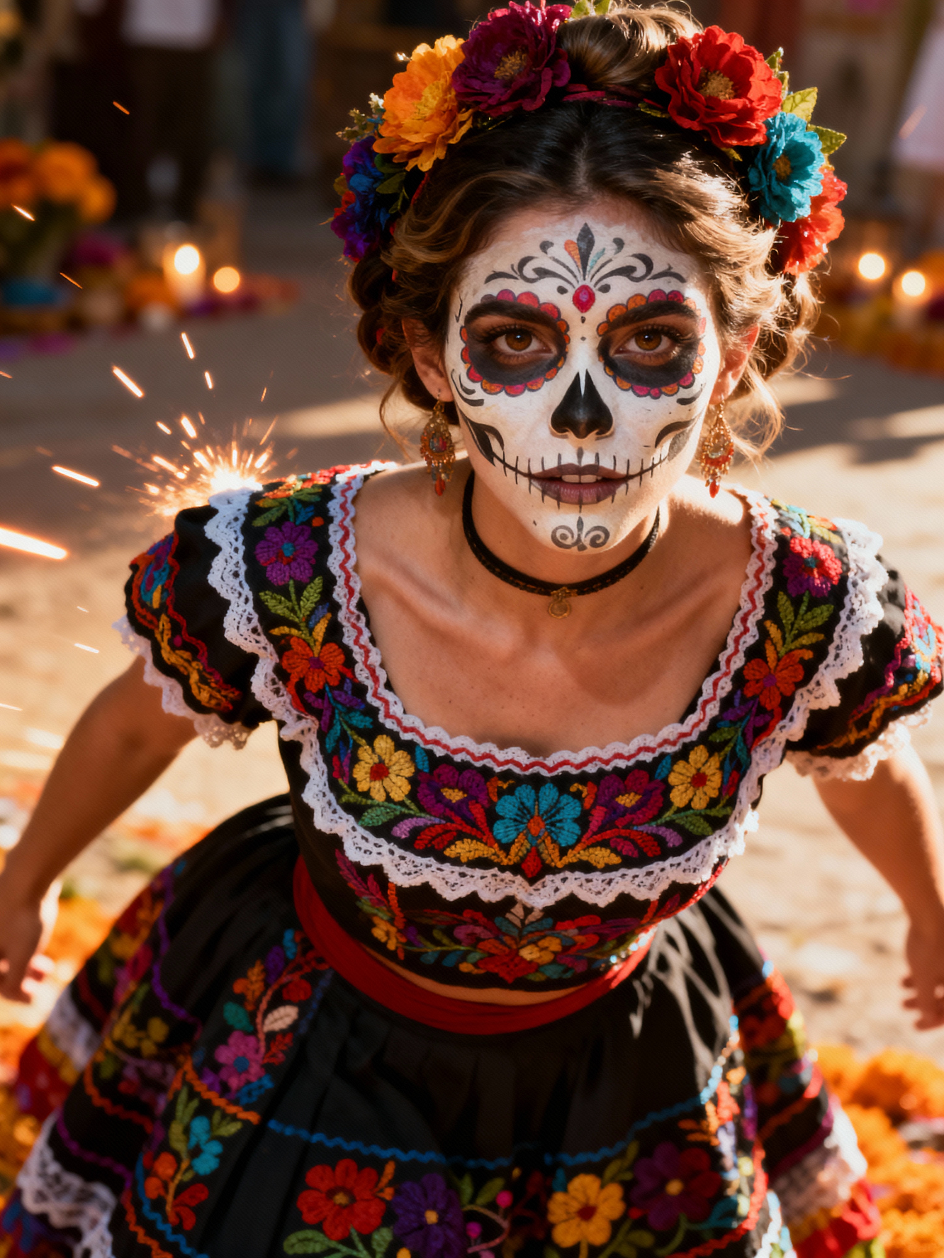 a stunning model in a festive outfit with traditional Mexican embroidery , embodying the remembrance and celebration of ancestors