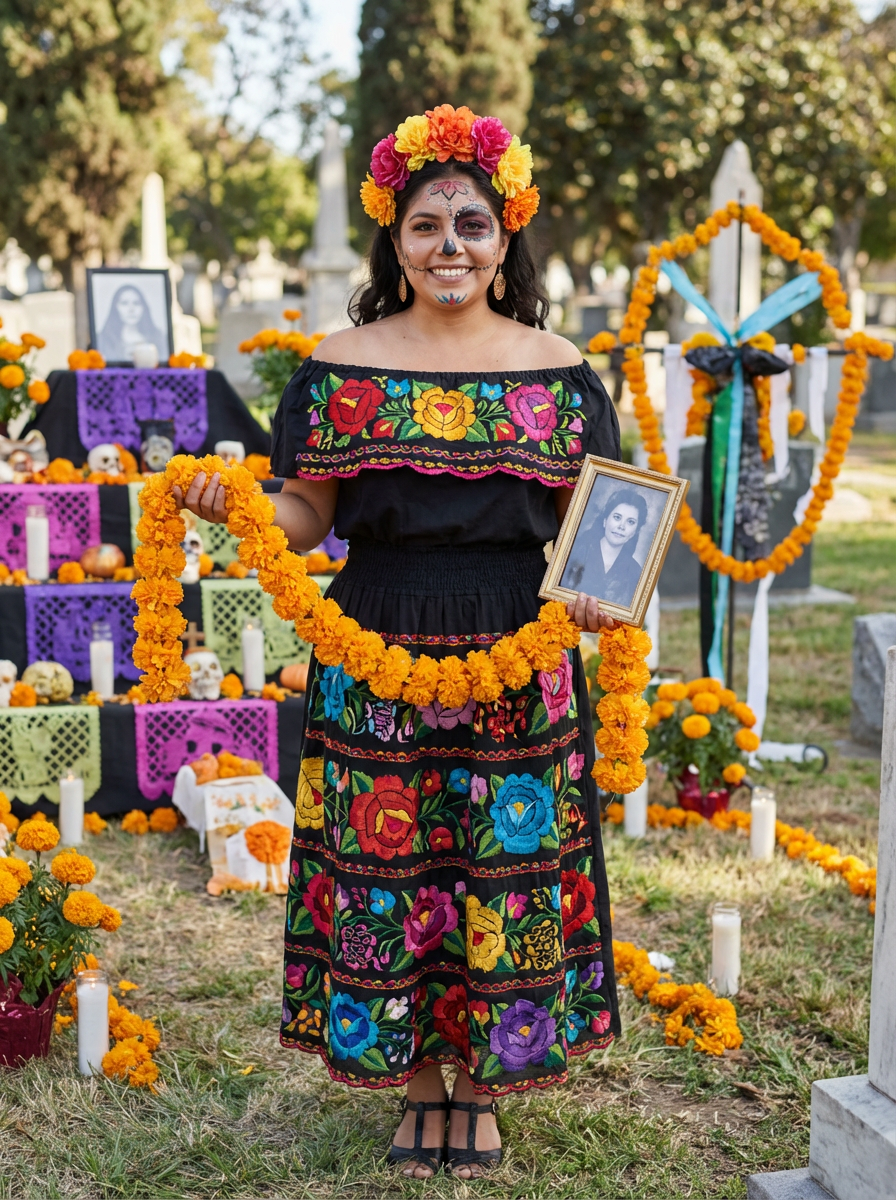 a stunning model in a festive outfit with traditional Mexican embroidery , embodying the remembrance and celebration of ancestors