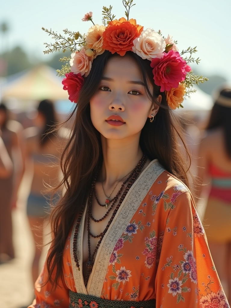 a stunning model in a flowy kimono and flower crown , embodying the fusion of bohemian and rock styles that define Coachella fashion
