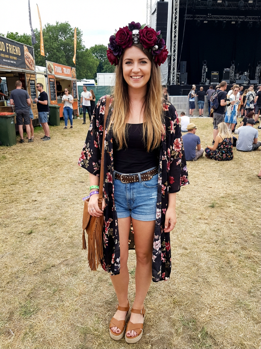 a stunning model in a flowy kimono and flower crown , embodying the fusion of bohemian and rock n roll styles at the festival