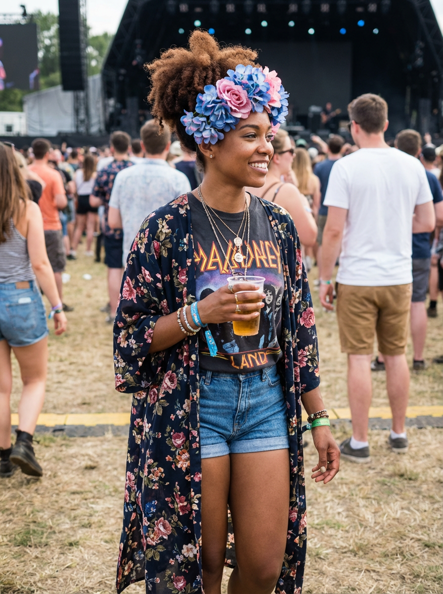 a stunning model in a flowy kimono and flower crown , embodying the fusion of bohemian and rock n roll styles at the festival