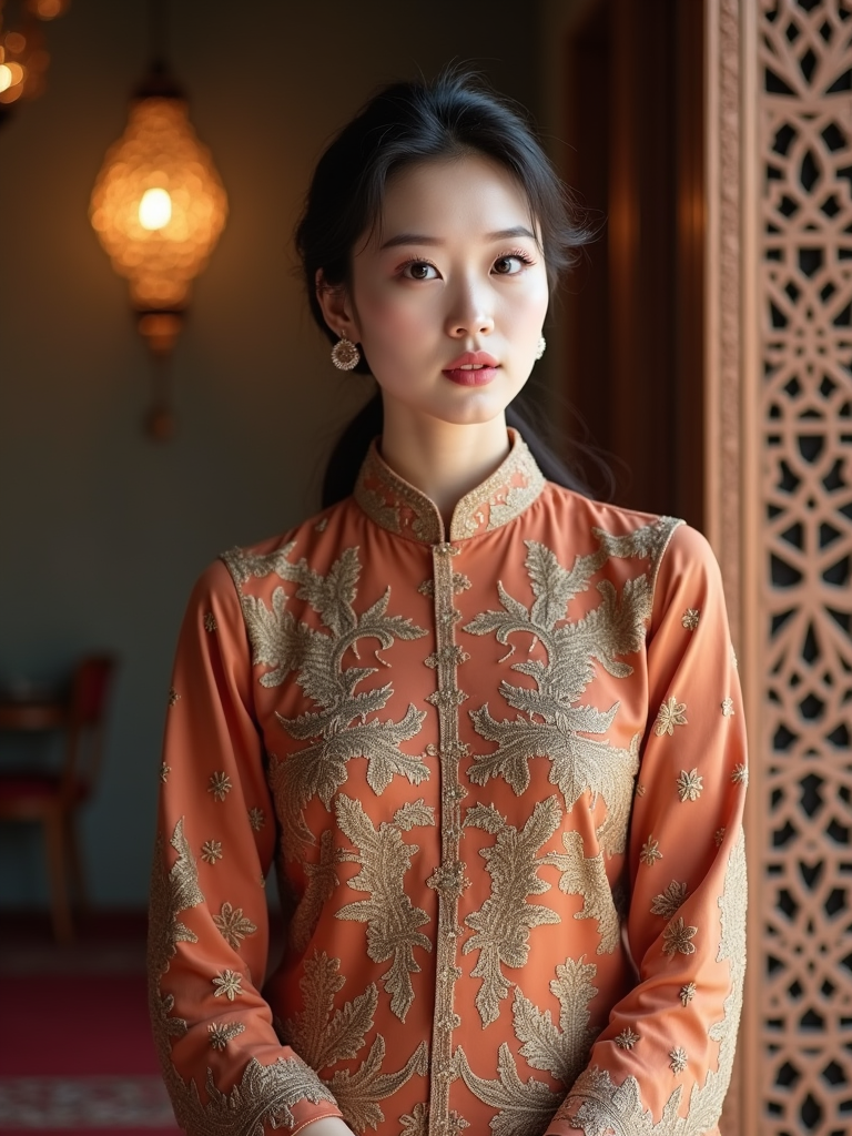 a stunning model in a modern modest outfit with traditional elements , capturing their serene look against a backdrop of Islamic geometric patterns and Ramadan decorations