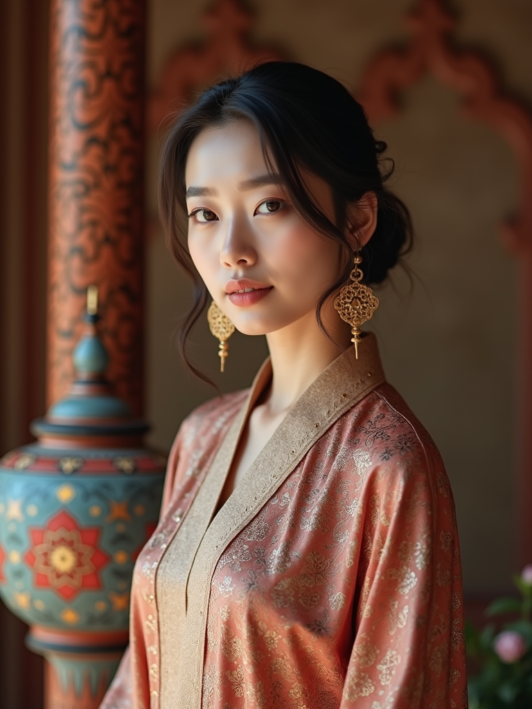 a stunning model in a modern modest outfit with traditional elements , capturing their serene look against a backdrop of Islamic geometric patterns and Ramadan decorations
