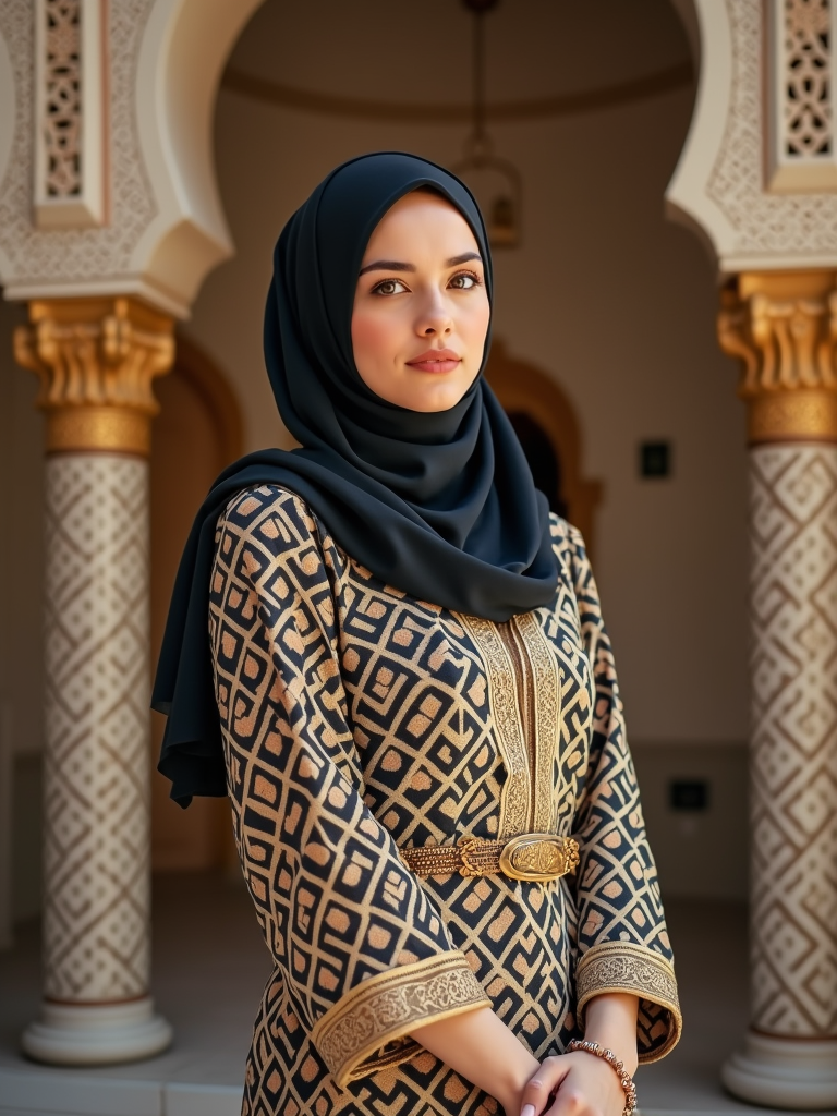 a stunning model in a modern modest outfit with traditional elements , capturing their festive look against a backdrop of Islamic geometric patterns and Eid decorations