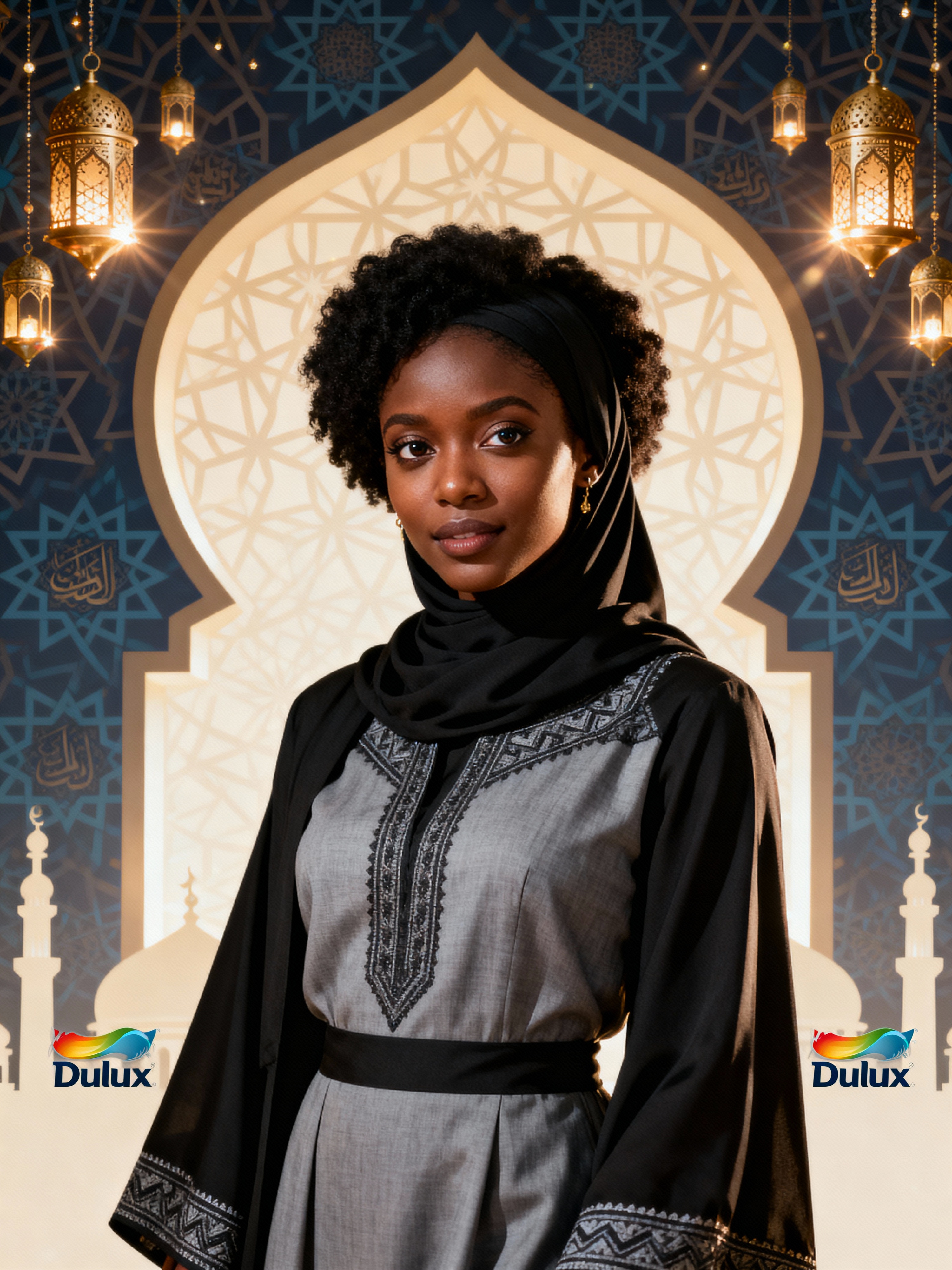 a stunning model in a modern modest outfit with traditional elements , capturing their festive look against a backdrop of Islamic geometric patterns and Eid decorations